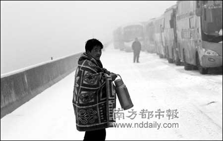 一名男子头上披着一床红色的毛毯,胸前挂着一床棉被,手上拎着一个热水瓶,一步一滑,在结冰的京珠高速路上艰难行走着。