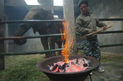 2008年1月28日,浙江宁波雅戈尔动物园,饲养员为大象烧起火炭。