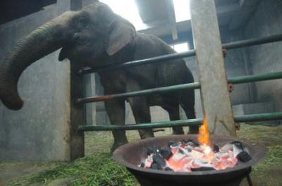 2008年1月28日,浙江宁波雅戈尔动物园,饲养员为大象烧起火炭。连日来宁波的低温天气让亚洲象笼舍里的两台空调已经不能保持室温在10℃以上,饲养员烧起人工木炭,为笼舍增温,保证大象安然度过寒冷的冬季。