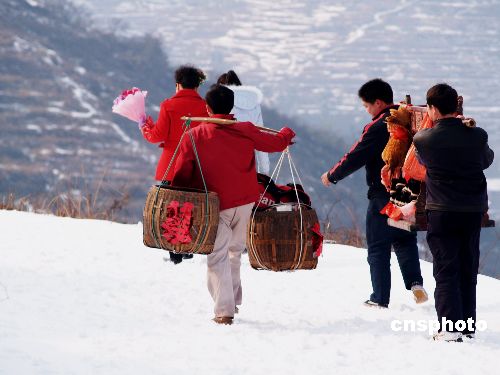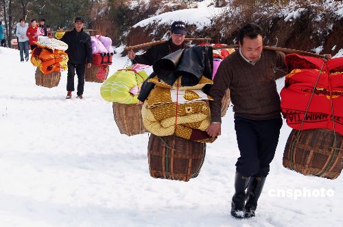 2月2日,新娘家人挑着嫁妆,踩着积雪送新娘。由于湖南地区又一次普降大雪、暴雪,路面结冰。当天,湖南冷水江一新郎步行十多公里踏雪将新娘迎娶回家。中新社发 龚高翔 摄