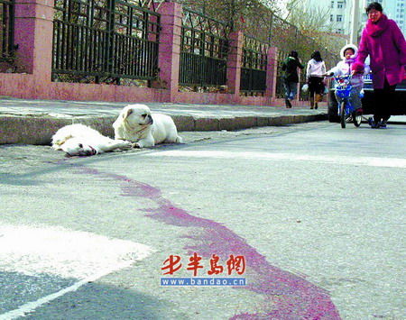 记者在现场看到,死去小狗的身下血迹斑斑,血迹一直从斑马线延伸至路边,蜿蜒有两三米长。“是这条京巴用嘴把它拖过来的。”目击者孙师傅说,这个事故发生在斑马线上,当时,一辆蓝色轿车撞上了小狗,小狗连叫都没有来得及叫出声来就倒在了车轮下。“肇事司机停车下来看了看,没有看到狗的主人,便驾车离去了。”孙师傅说,当时,京巴看到自己的同伴突然不动了,一下愣住了,接着冲了过去。“它又拱又叫,看样子想叫它快跑,因为还不断有车辆从这个路口驶过。”京巴看同伴没有反应,它咬住遇难小狗的尾巴,用尽全身力气往路边拖,“狗太小了,也没多大劲,拖一拖便停一停,最终将死去的小狗拖到了路边。”