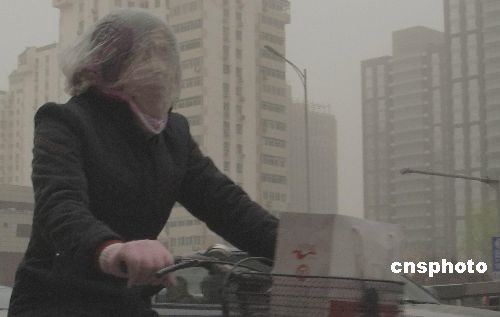 2008年3月18日上午,中国北方春季首场重度扬沙浮尘天气降临北京。在北京西城区阜成门街头女士戴纱巾骑乘单车。 中新社发 邹宪 摄