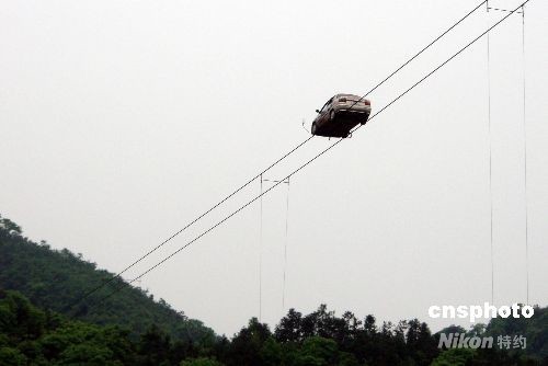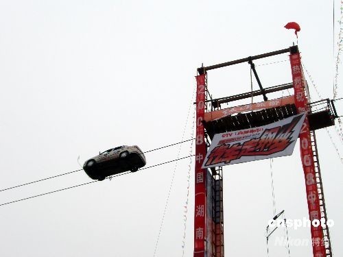 4月27日,被称为“中国车王”的河南汉子刘锁柱,在湖南平江县驾驶着一辆未经改装的普通小汽车,在距汨罗江45米的高空上,沿着两根钢丝铺成的“天路”成功行驶了230米。据介绍,这个距离目前为“中国之最”。 中新社发 邓霞 摄