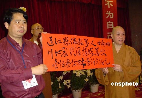 在今天的募捐仪式上,连江县佛教界人士共向四川灾区爱心捐款一百三十多万元人民币,由连江县佛教协会会长界渡法师转交连江县红十字会汇往四川灾区。