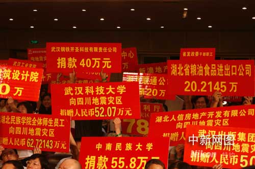 中新网武汉5月22日电 (记者 艾启平)22日晚8点至11点,湖北省抗震赈灾晚会《我们心相连》在武汉洪山礼堂举行。在晚会现场,中共湖北省委书记罗清泉、湖北省长李鸿忠等带头为四川地震灾区捐款,全省企业和社会各界及电视观众纷纷响应,截至晚会结束时共收到捐款超过一亿元人民币。