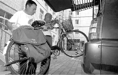 在志愿者的帮助下,杨永国老人(右)把自行车抬到中国邮政集团公司的车上,将自行车赠与该公司。 记者张沫/摄