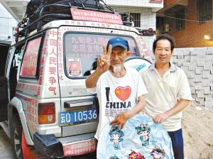 记者在广州中大北门后面的一个小旅馆见到了张汝侯、张光泽父子和他们贴满奥运宣传标语的越野车。张汝侯老人1919年出生,白族人,走路有点颤抖,很难相信他坐车行了31个省市自治区、341个市、2000多个县。