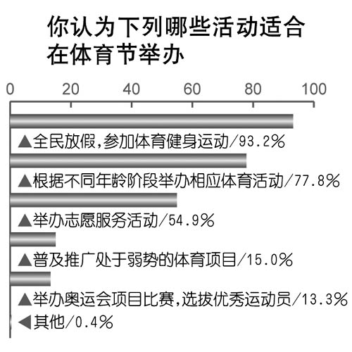 调查表明,93.2%的公众表示中国体育节那天应该全民放假,参加体育健身运动,77.8%的公众认为应根据不同年龄阶段举办相应体育活动,54.9%的公众认为应该举办志愿服务活动,15.0%的人觉得要普及推广处于弱势且公众关注度不高的体育项目,还有13.3%的公众认为应该举办奥运会项目比赛,选拔优秀运动员。 (记者王聪聪 制图:杨大昕)