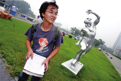 昨天上午9点40分,黎俊来到清华美院。深灰色T恤、卷边牛仔裤、磨旧了的背包,刚下火车的黎俊看上去很有些风尘仆仆的味道。