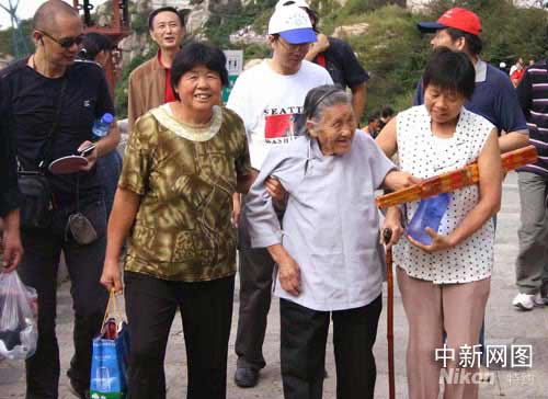 图为来自山东聊城的九十一高龄的老奶奶在家人的搀扶下从南天门一步步走向泰山之巅。摄影 张璐