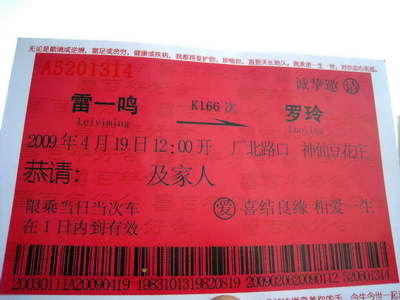 中午11时多,来宾们先后到达婚礼现场,每个人手里都拿着一张“火车票”,仔细一看,这可不是普通的火车票,而是新郎雷一鸣为婚礼专门设计制作的请柬。请柬有一张明信片大小,被设计成“火车票”样式,正面“百年好合”的红底上印有“雷一鸣”至“罗玲”和“K166次”等几个黑体大字,主要内容是恭请来宾前往“厂北路口**豆花庄”参加两人的婚礼,并且“限乘当日当次车,在一日内到有效”。