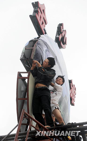 6月21日,福建晋江金井镇围头村村民在“莲花”登陆前加固广告牌。今年第3号热带风暴“莲花”当日20时30分在福建晋江市东石镇登陆。新华社记者 姜克红摄