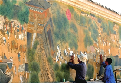 经过近俩月的努力,昨天,在延庆大榆树镇奚官营村,一幅由4名农民画家集体创作的《清明上河图》壁画终于落成。村委会表示,将在村里其他角落绘制壁画,打造“亚洲第一壁画村”。