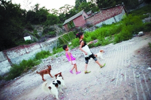 孩子在金顶山村玩耍。苹果园附近的金顶山村居住着百余乞讨人员。记者 王嘉宁 摄
