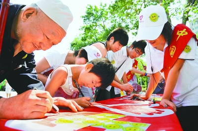 7月20日,乌鲁木齐团委在全市开展名为“我的微笑,我的爱”志愿者公益大行动。通过贴笑脸帖的方式,将欢笑传递给市民。翁奇羽摄 (人民图片)