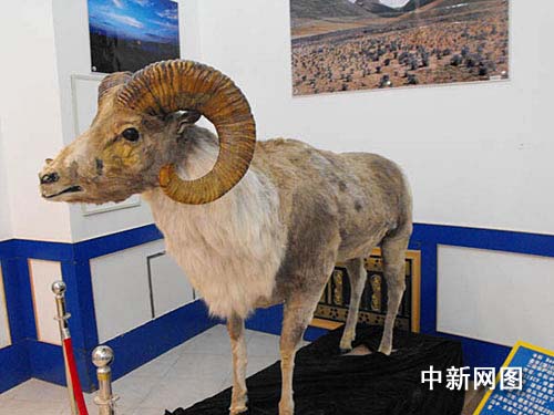 阿克塞哈萨克族自治县县委宣传部热提剑今日向记者介绍,该县展览馆陈列的盘羊标本是国家二级保护动物,属牛科中体型最大的一种,栖息于海拔2000——5000的沙漠和山地交界的冲击平原和山地低沟中。雄性角粗大,由头顶向下并向后螺旋状弯曲,几乎可达360度,主要分布在阿克塞哈萨克族自治县境内于大、小哈尔腾前山和安南坝地区。