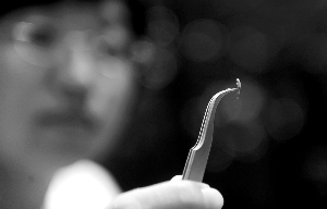 在实验室中,发掘人员用显微镜仔细观察每一小拨细沙。