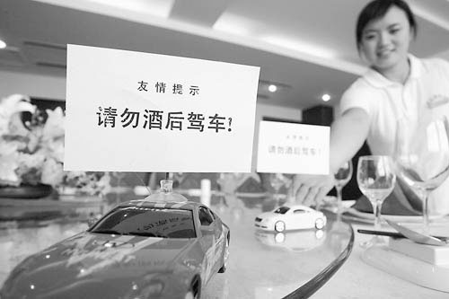 8月16日,山东潍坊市区一家酒店内,服务员正在将“请勿酒后驾车”标识牌摆放在酒桌上。 张驰摄
