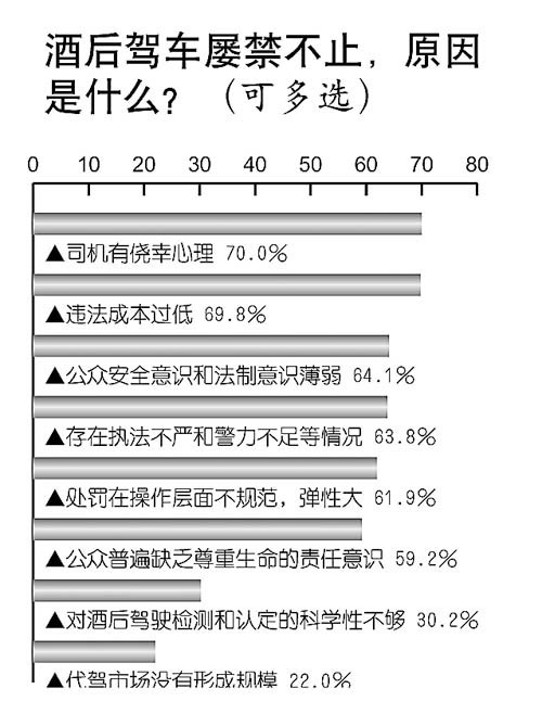 酒后驾车现象屡禁不止,原因是什么?调查中,70.0%的人首选“司机有侥幸心理”,69.8%的人认为是“违法成本过低”,64.1%的人表示“公众安全意识和法制意识薄弱”,59.2%的人表示“公众普遍缺乏尊重生命的责任意识”,22.0%的人选择了“代驾市场没有形成规模”。