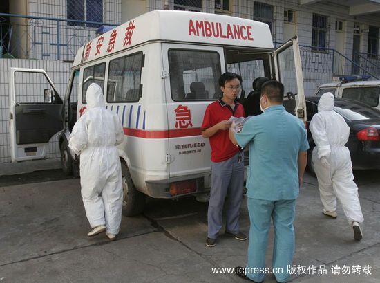 2009年8月30日,河南省新安县医护人员正在接转甲型H1N1流感疑似病人