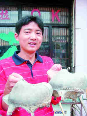 廖海兵手上拿的就是将在鞋展上出现的最老的木屐。李欣摄