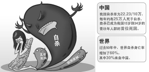 据世卫组织统计,过去50年中,世界自杀身亡率增加了60%。今年上半年一项最新发表的全球性医学研究指出,世界各地每年约有100万人自杀身亡,其中30%来自中国。自杀已成为导致全球15岁至44岁的人死亡的3大主要原因之一。