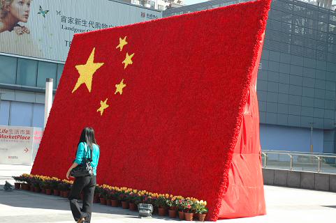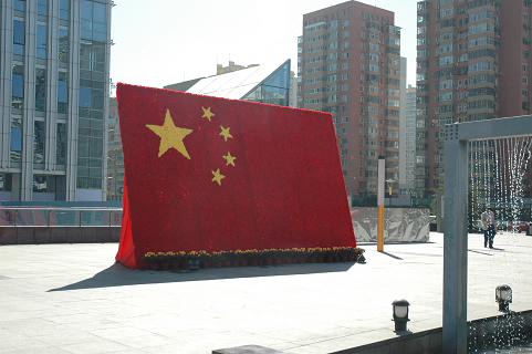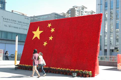 在双井桥乐成中心,立体的花坛边,市民刘乐和女朋友相拥而过。空旷的广场和高耸的大楼的陪衬下,一面鲜红的国旗在日光的下光彩夺目,非常乍眼。这面别具匠心的旗帜,由上千朵绸缎质地玫瑰组成,绣着5棵五角星。刘乐随即拿出了相机,给女朋友来了一张。“今天有空,刚好陪女朋友出来逛逛。”刘乐告诉记者,“昨天坐公交车回家,一乍眼就瞧见了这个,所以我们就过来拍拍照。”