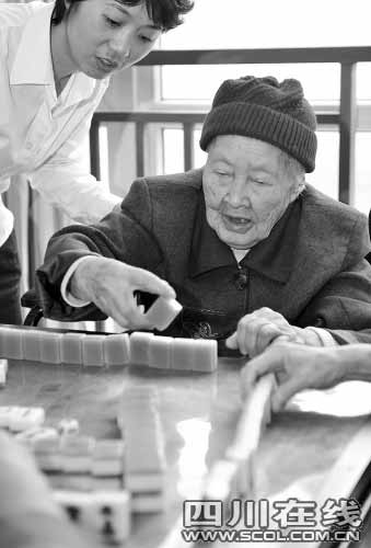 昨日上午,在成都市第一社会福利院8楼活动室里,一场麻将正打得火热,参战者都是头发花白的老人。张钰林老人兴致勃勃地坐在旁边观战,还不时支两招,张钰林老人一身红衣红帽,显得特别喜庆。原来,昨天是她104岁大寿,而打麻将的老人们都是她的姐妹弟兄,专门为她来祝寿的。