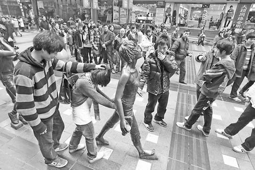 北京女孩清越去年6月28日参加了一次“定格”:大家随意在路上走,一个信号发出来,参加活动的人就保持不动,持续3~5分钟。“我们想和周围的行人形成动静的对比,纯粹就是好玩。”参与者全从网上召集,活动那天来了将近200人。