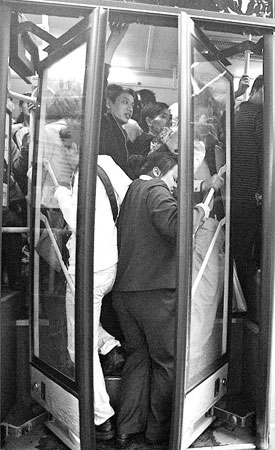 早上7:35,记者在南坪麦德龙车站等来一辆464公交车,与记者一同上车的还有8人。车门刚打开记者就发现,在门口已经站了5名乘客。刚上车的一名女乘客手里拿着一盒牛奶,由于前面的一中年男子被挤得重心不稳,突然往后猛退,女乘客手里的牛奶被压爆。鹅公岩南桥头有人下车,站在门边的记者只能下车让路。哪知十余人越过记者一拥而上往车上挤。直到车门关闭,记者也没能再次挤上车。