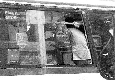 杨家坪,公交车上人太多,一名乘客只好坐在车窗上 本组图片记者 刘嵩 摄