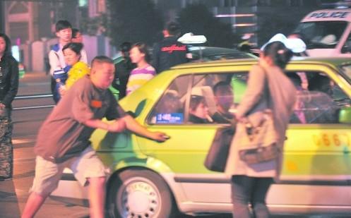 6点50分,一辆出租车在小龙的“护送”下驶进广场,还没等车完全停下,几个大高个子一拥而上,小龙被挤倒在地。
