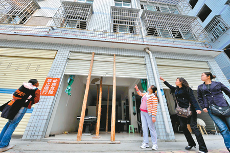 昨日,本报报道忠县拔山镇一栋商品房出现质量问题,靠10多根木棒支撑的事后,经有关专业人员现场踏勘,初步查明:该工程未按设计图纸施工,大梁的断面尺寸不足;梁构件出现裂缝为梁端抗剪承载力不足,引起剪切裂缝,主要成因是混凝土强度较低;上部结构墙体开裂原因主要为梁体开裂后向下变形,导致其上部墙体向下沉降,并使周围墙体被拉裂。