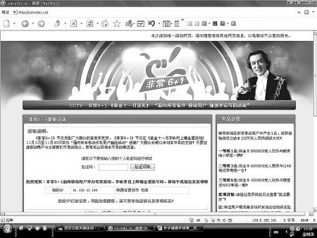 记者在“输入验证码”一栏中输入了张小姐收到短信上的验证码3358后,便看到中奖信息:您是本次活动二等奖用户,您将获得“非常6+1栏目”送出的惊喜奖金¥60000元及三星Q40笔记本电脑一部。页面下方有“非常6+1”的全国唯一客服电话400-6151-211。拨通该电话后,记者表示自己就是中奖者,一位男子提示记者先要填写个人资料,填写后按照网站提示把手续费汇到相关账号才能领到奖品。