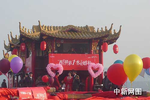 中新网杭州11月22日电(记者 柴燕菲 实习生 倪幼杰)今天下午,西湖上举行了一场独特而浪漫的水上婚礼。这是在西湖上迎来的第一对新人。更为特殊的是,婚礼的新郎是刚刚参加了国庆六十周年阅兵的战士。