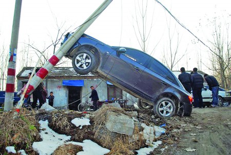 11月22日16时许,山东省巨野县职业教育中心北50米拐角处,一辆小轿车爬上了线杆的斜拉线。据附近居民介绍,当时轿车准备自西向南转向,因避让逆向驶来的车辆而出现了意外,先是撞断了一根线杆,紧接着爬上了另一根线杆的斜拉线。(黄体军 杨斌 闫成帅 摄影报道)