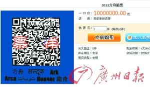淘宝上,有卖“方舟船票”的,有卖“方舟直达解放牌货车车票”的,有用谷歌地图追寻方舟在地球上的停靠点的。一名网友1000万元叫卖“方舟船票”最为火热,不少网友回帖询问能否打折、如何鉴别真伪,还有询问有否包含灾难后重建送指定城市户口。