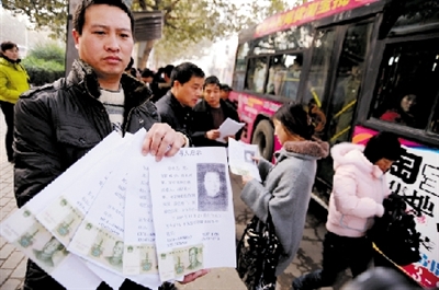 “你坐公交我付费,只为寻找老父亲。”昨日15时,在河南郑州嵩山路与陇海路交叉口东南角公交站牌处,几名男子拿着许多寻人启事见到乘坐公交车的人就送上一张并这样解释。当市民往寻人启事一看,吃了一惊,因为每张寻人启事上都贴有一张一元面值的纸币。