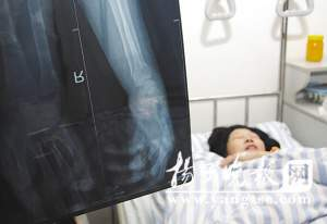 昨天晚上,记者赶到杨老太的治疗医院南京市中医院,在2楼的骨科病房,看到了受伤的杨老太。她躺在病床上,已经不能动弹,由于躺在地上胃部受凉,下午一直呕吐不止,医院已经为杨老太的右胯和右臂做了固定正在牵引。她的女儿小汪服侍母亲,小汪还取出母亲受伤后的X光片,并指着X光片告诉记者,“右手腕和右胯骨都出现了骨折,事实摆在眼前,她肯定是被人撞了!对路人指责我妈‘碰瓷’一说,我们不加评价,毕竟‘碰瓷’的事情不是在南京第一次发生,但是大家应该想到‘碰瓷’的谁敢到医院拍片子,我妈妈这身上可都是新伤啊!”
