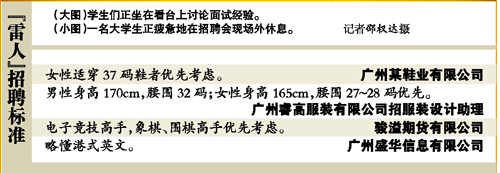 在招聘会上,“吃苦耐劳”、“责任心强”等择人标准成为用人单位的最爱。但有同学却认为,这个标准太模糊,“能不能吃苦耐劳,很多都是吹出来的,没有实际意义。”广外市场营销专业的孙同学认为,企业最好能提供一些更有用的信息和更明确的要求,比如薪酬水平。