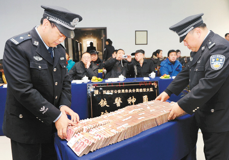 警方清点追回的百万余元购房款,准备返还受骗群众。