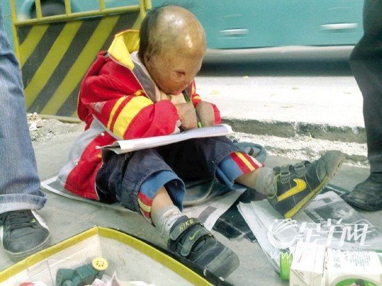 小远发是个孩子———真真正正的孩子。但看见他第一眼时,记者也被震惊了:他整个头部像被罩上了一层暗红色的蜡质面具,眼睛、鼻子、嘴、耳朵所在的部位,都被烧成一个小小的洞。他坐在路边用已经没有了五指的“双手”,夹着一个塑料小车玩耍。