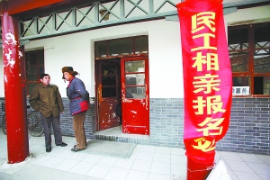 26日上午9时许,略显冷清的北京望京公园里,几条带着相亲标语的红色横幅旁,时不时会有几个晨练者走过。民工相亲会的组织者们在公园管理处的办公室里静待相亲者。尽管此后的一小时里,先后有10余名相亲者鱼贯而入,但令人担心的一幕还是发生了,前来相亲的基本都是男性。