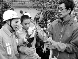 一条巨蜥突然在海甸岛德利路得利小区出现,让居民们惊恐万分。今天上午10时35分消防官兵和动物保护人士联手,将这条躲藏在得利小区与港湾小区夹墙内的巨蜥抓获。