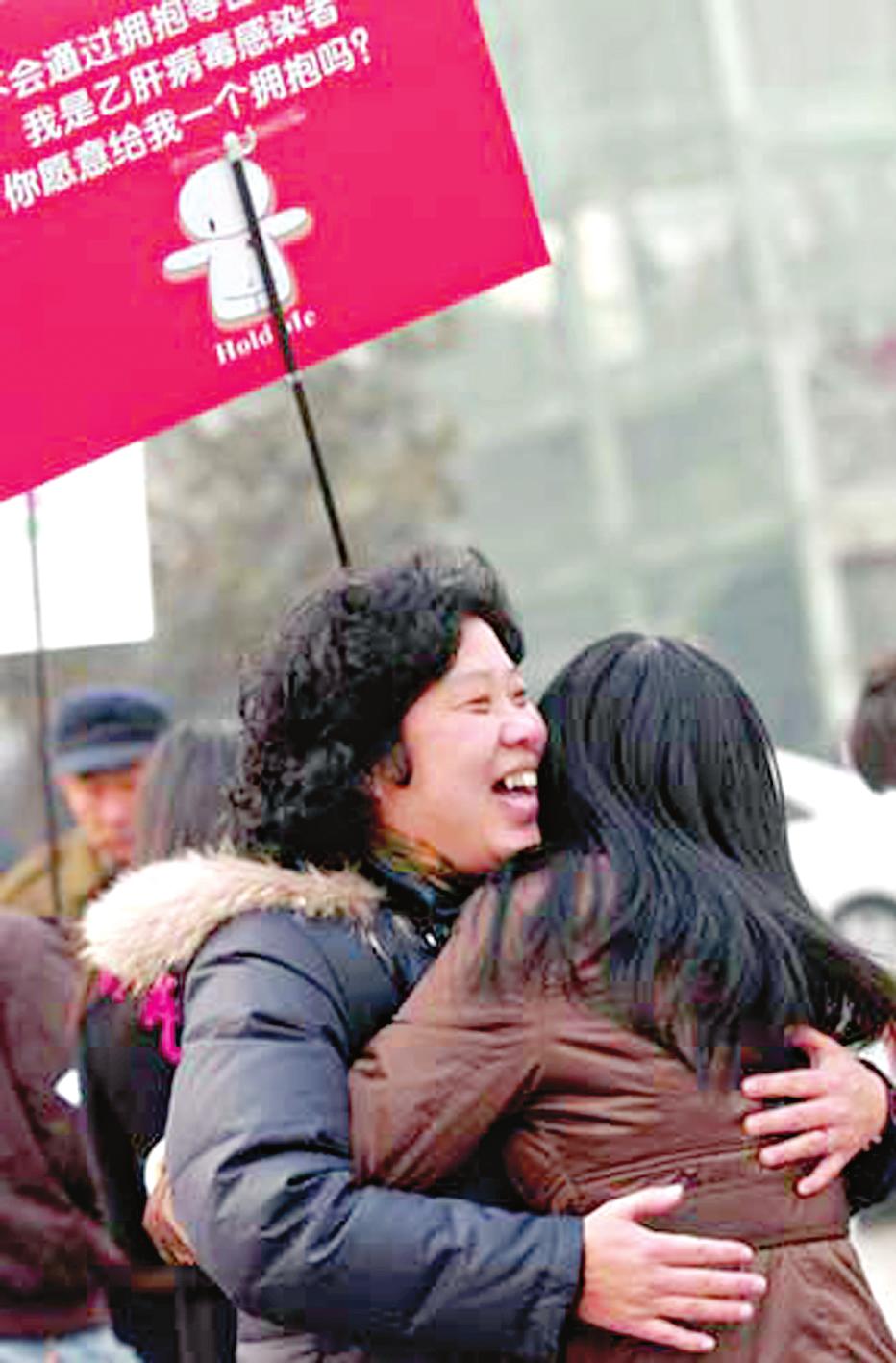 2009年1月4日,张雯(右 )在郑州最繁华的二七广场向陌生人索要拥抱消除对乙肝患者的社会歧视 受访者供图