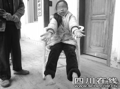 在桃坪乡小学的操场上,刘雅同学和其他小朋友一样,跑步、打球、跳橡皮筋,一点看不出“异常”;可当这个小女孩撸起袖子和裤管,让旁人仔细看她的双手、双脚时,人们往往会大吃一惊:每个手脚都长着“六指(趾)”,就是说她比普通人多了4根指(趾)头;尤其是右手的第六根指头与其他指头的方向相反,是倒着长的,而其他的“六指(趾)”则顺着长出来的。