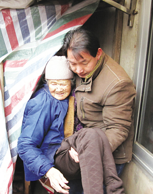 前天南京飘起了雪,在建邺区江心洲街道,一位九旬老太却蜗居在自家院中的窝棚里。窝棚的四周用塑料布裹了一圈,即使这样,仍然透着寒风,老太有4个女儿2个儿子,而且都丰衣足食。更令人诧异的是,柴房是老太的儿子安排的,而柴房的一墙之隔,就是她外孙女家的房子,但是用来出租和堆放杂物。老人的邻居说,有这样的儿孙,恐怕心比天还要冷。好在江心洲街道工作人员在得知此事后,立即找到老人的子女,斥责了他们的行为并将老人先搬回儿子家居住,下一步街道将和老人的几个子女共同协商赡养问题。