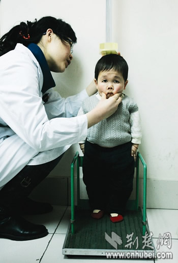 罗教授边检查边说,吴康眨着眼睛专注地听,听到罗教授的诊断,他咧开嘴笑了,父母急切地问,“真的?”罗教授一指站在一旁的袖珍大学生陈巍,“你们看,这孩子治疗一年就长了12厘米,要是有钱继续治,起码能长到1.6米!”