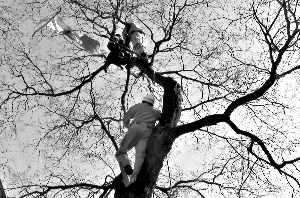 10分钟后,石景山银河消防中队、派出所民警先后赶到,看到一名头戴皮帽的老年男子坐在树叉上,离地面约10米高,双手抱住一根直径不足15厘米的树枝。树上垂下一条红色条幅。