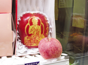 昨天,记者来到该百货店内的水果区看到,这个标价8800元的苹果,大小与一个排球差不多,色泽鲜红油亮,重约1.5公斤,用独立纸盒包装,苹果上面“长着”金色的释迦如来像,花纹细致精美。标签显示,这个“天价苹果”出身“显赫”,是“日本特级富士”,是从日本最著名的苹果产地——青森县空运过来的。据店方介绍,像这种“8800元”一个的苹果在培育期间,一棵树上一般只让结两个苹果,其余不符合标准的苹果会被果农摘除掉。更加费力的是,每个苹果在刚结出的时候就开始贴膜,要经过一百次以上的换膜,才能得到苹果上各种精美的图案。日本“特级富士”有一个其它苹果都没有的最大优点,就是它在常温下可以保存半年,切开后,半个月才会出现氧化现象。
